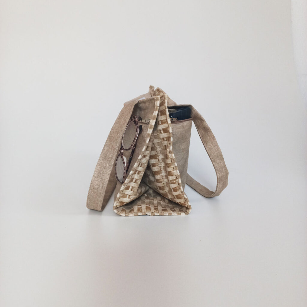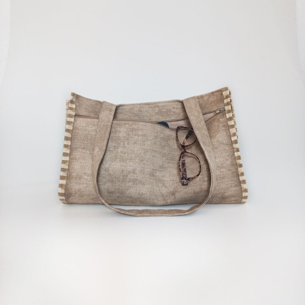 Handbag, lined, made with upholstery material. Sewing bag that closes with zippers on both sides of the handbag. The large/main opening closes with Velcro. The size of the complete handbag is 35 x 31 cm.